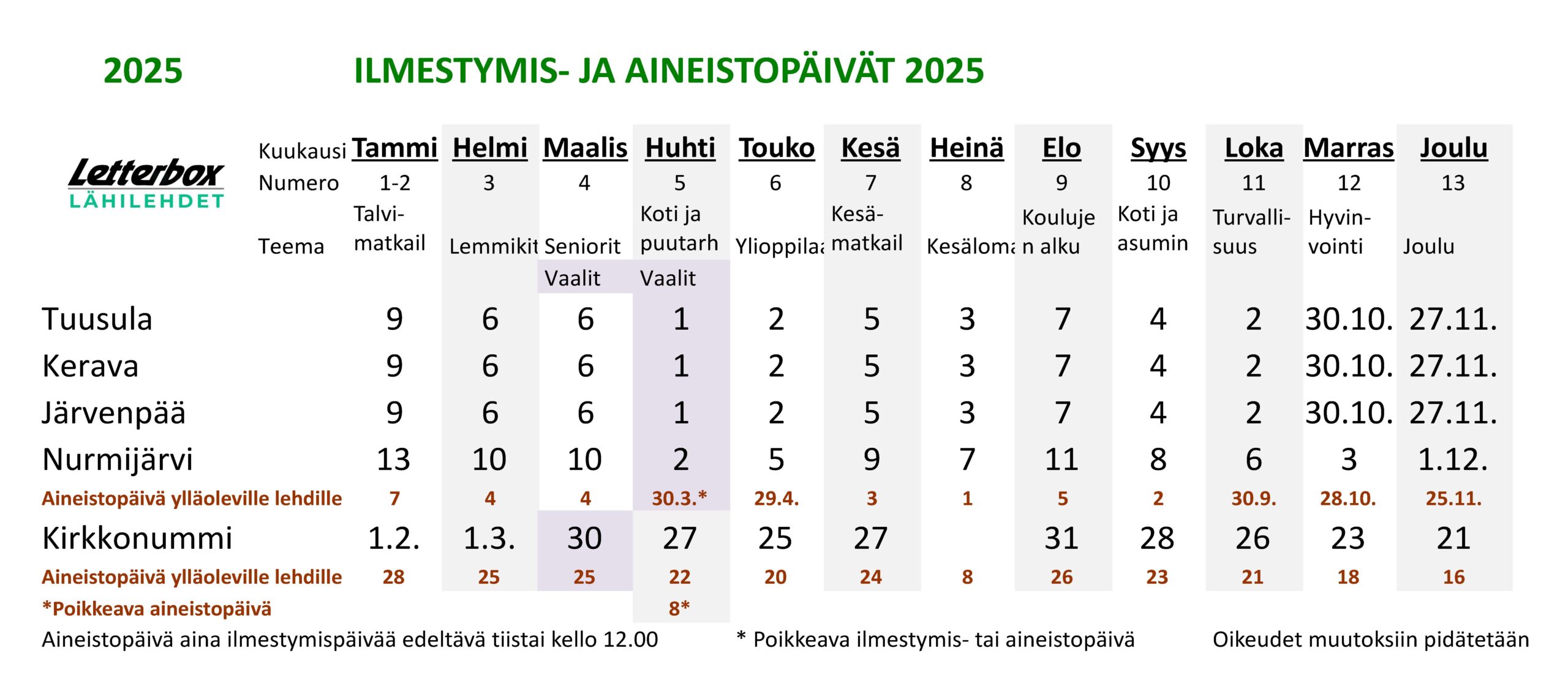 Valmisaineistot pdf-muodossa sanomalehtiasetuksin viimeistään Ilmestymistä edeltävänä tiistaina klo 12.00 osoitteella: taitto@letterbox.fi