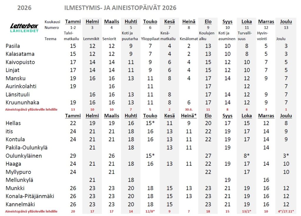 Valmisaineistot pdf-muodossa sanomalehtiasetuksin viimeistään Ilmestymistä edeltävänä tiistaina klo 12.00 osoitteella: taitto@letterbox.fi
