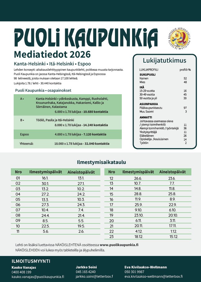 Valmisaineistot pdf-muodossa sanomalehtiasetuksin viimeistään Ilmestymistä edeltävänä maanantaina klo 12.00 osoitteella: ilmoitukset@puolikaupunkia.fi